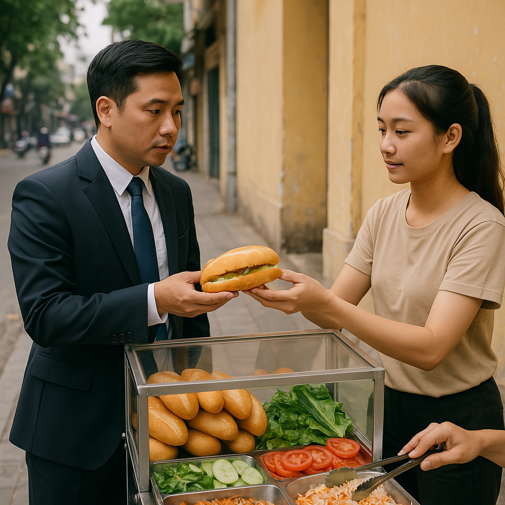 Ánh mắt ông dừng lại ở một xe bánh mì nhỏ, có phần cũ kỹ nhưng gọn gàng, sạch sẽ. Người bán là một phụ nữ trung niên, tóc búi gọn, mặc chiếc áo bà ba cũ màu nâu sậm. “Cho tôi một ổ đặc biệt,” Hòa nói, rồi đứng chờ. Người phụ nữ nhanh nhẹn kẹp bánh, rưới nước sốt, thêm vài lát chả lụa, rồi gói cẩn thận trong tờ giấy báo.