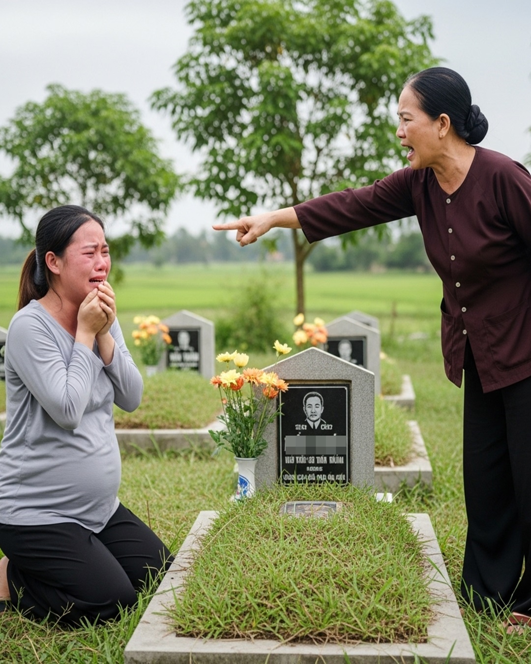 Tin đồn lan nhanh như gió. Người thì nói chị đi bước nữa, người lại bảo “tuổi còn đang trẻ, chồng mất không chịu được lại chưả vơí ai rồi”. Còn mẹ chồng chị – bà Dậu – nghe xong như phát điên. Bà xông đến giật tóc, tát liên tiếp con dâu rồi gào lên: